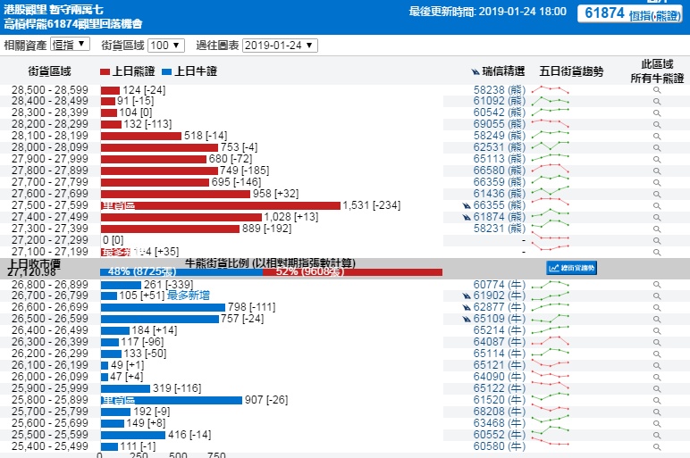 智通财经APP获悉,截至1月24日,恒指最新的牛熊街货比例48:52。从瑞信恒指牛熊证街货分布图中得到的数据显示,熊证街货重货区在27500-27599区间,该区间最新熊证数量为1531张,减少234张,最多新增在27100-27199区间,新增35张。牛证街货重货区在25800-25899区间,该区间最新牛证数量为907张,比上一交易日减少26张,最多新增区间在26700-26799区间,新增51张。