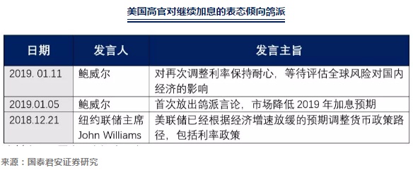 美国金融压力仍低于历史平均水平 数据来源:Wind,国泰君安证券研究 美国金融体系面临的压力 尚不构成对加息的阻碍 金融压力对于货币政策变动意义重大,货币当局的政策变动尤其是收紧行动,必须要保障金融系统不会因此承受过大压力以至于发生系统性风险和累及经济增长。 圣路易斯联储金融压力指数衡量了美国金融体系面临的压力状况,该指标显示:与金融状况指数相似,尽管过去几个月金融压力有所加大,但1月以来再度回落且仍低于历史平均水平,即目前美国金融体系面临压力并不大。 我们认为联储加息可能会放缓,但不会缺席。美国经济虽然放缓,但在就业表现强劲、薪资持续增长、居民资产负债状况良好等支撑下,富有韧性的经济基本面决定了加息进程尚未结束。 我们预计美联储可能还需要加息1-2次后,才会停止加息。 从美国高官发言来看,联储加息的预期正在转弱 在公布的2019年1月9日的FOMC 会议纪要中,美联储多位高官也发表讲话表示对加息有耐心,市场对于美联储加息的预期明显转弱。 美联储的本次加息态度较前期更偏鸽派表现在三个方面: 1)对经济,2018-2019 年经济增速预期较 9 月不同程度下调; 2)对通胀,2018-2019 年 PCE 和核心 PCE 预期较 9 月也均下调; 3)对目标利率,之前称目标利率宜进一步上升,此次称利率宜进一步有所(some)上升,并表示将继续关注全球经济和金融进展,并评估它们对经济前景的影响。 中国央行将进一步强化逆周期调节 着力缓解信贷供给的制约因素 除了创设CBS之外,在中国央行的主要资产中,对其他存款性公司债权和其他资产这两项的比重都在持续增加,央行正积极通过政策缓解信贷供给的制约。 人民银行全面降准1个百分点释放流动性,净释放长期资金约8000亿元。置换中期借贷便利每年也可直接降低相关银行付息成本约200亿元。 人民银行决定调整普惠金融定向降准小微企业贷款考核标准。这有利于扩大普惠金融定向降准优惠政策的覆盖面,引导金融机构更好地满足小微企业的贷款需求,使更多的小微企业受益。 其他多个经济体央行维持利率不变 资料来源:国泰君安证券研究 其他经济体货币政策未出现重大调整 加拿大、巴西、泰国和英国纷纷表示维持当前利率水平 宽松派:巴西和泰国。巴西央行第三次将基准利率维持在6.5%不变,未提及短期内收紧政策的可能性。 收紧派:加拿大和英国。英国央行认为世界经济下行风险将有所增加。因此,维持银行利率不变和政府债券购买,有助于维持总体流动性,保持英国经济增长势头和促进就业。 而随着2019年大选脚步逐渐临近,印度政府也在不断施压央行降低利率并实施更宽松的货币政策。此次印度央行行长辞职,货币政策面临不确定性挑战。