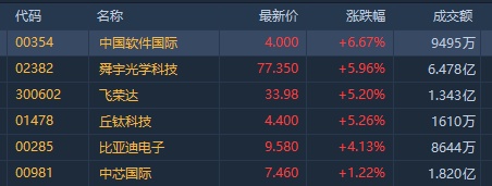 智通财经APP获悉,华为概念股今日延续强势,截至发稿,中国软件(00354)涨6.67%,舜宇(02382)涨5.96%,丘钛科技(01478)涨5.26%,比亚迪电子(00285)涨4.13%。
