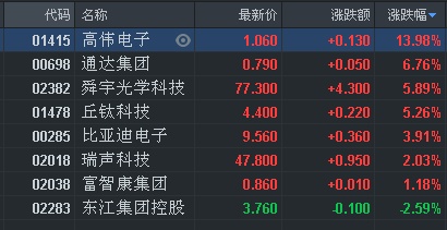 智通财经APP获悉,手机产业链股早盘集体发力,截至发稿,高伟电子(01415)涨13.98%,通达集团(00698)涨6.76%,舜宇(02382)涨5.89%,丘钛科技(00285)涨5.26%,瑞声科技(02018)涨2.03%。