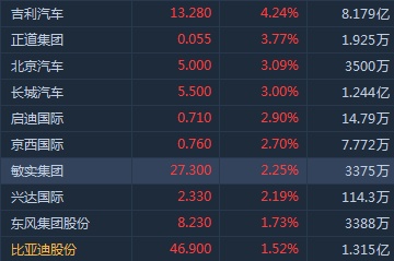 智通财经APP获悉,汽车股午后整体上扬。富瑞指内地汽车市场正走出低谷,低估值企业或先获提升。截至14时06分,吉利汽车(00175)涨4.24%,报价13.28港元,北京汽车(01958)涨3.09%,报5港元,长城汽车(02333)涨3%,报5.5港元。
