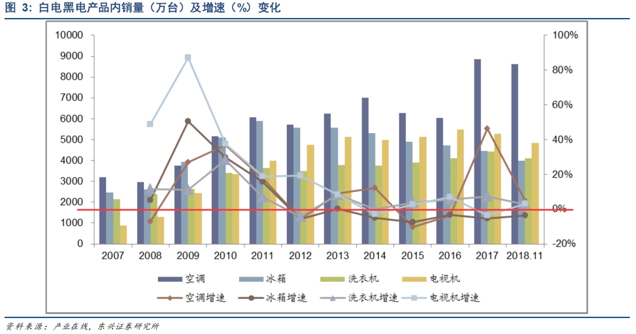 家电行业2018年的数据表现并不乐观。根据产业在线数据,2018 年空调行业内销累计销售8616 万台(+4.73%),出口累计5382 万台(+8.3%),下半年以来空调终端零售景气度迅速下行,渠道库存积压导致整机厂开始主动控制出货节奏;冰箱内销遇冷下滑、外销平稳增长(1-11月内销下滑3.7%,出口稳增3.92%);洗衣机1-11月累计内销4097万台(+2.71%),累计出口1818万台(+0.3%)。黑电方面,产业在线统计1-11月彩电内销4848万台(+3.48%),外销受益于世界杯赛事拉动销量8781万台,同比增长19.58%,拉动整体销量增长13.32%;厨电受地产减速影响表现低迷,1-10 月内销同比下滑4.57%。内销数据整体表现低迷,毫无疑问,若没有外在的刺激作用,2019年数据将会继续低迷下去。