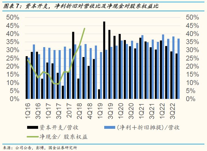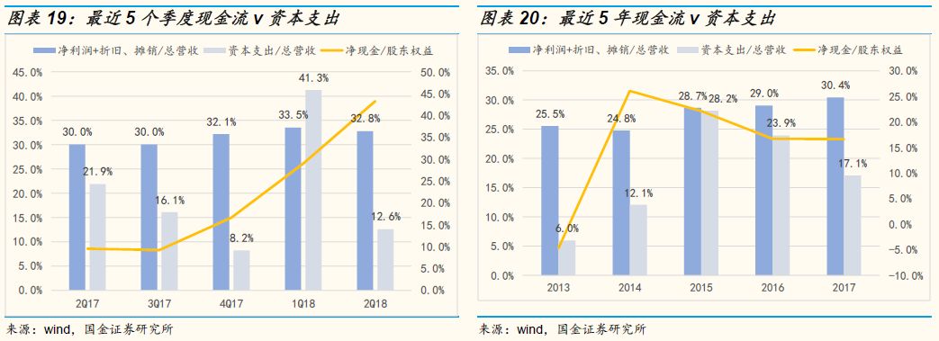 近五个季度净现金/权益指标稳步攀升,公司抗风险能力进一步增强。我们用“净现金”(账面的货币资金减去带息负债)和“股东权益”的比值衡量公司账面上真正可以自由使用的资金量,这个指标越高说明公司可以动用的自由现金越多,在行业下行周期或者更加有能力抓住行业的投资机会。从下图可以看出虽然过去五年公司的净现金/权益的比值呈现下行趋势,但是公司从2017年第二季度开始净现金/权益指标稳步攀升,侧面印证了公司的盈利能力不断增强。
