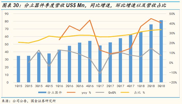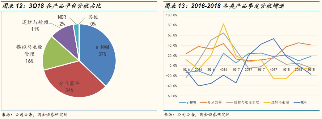 分立器件是公司营收占比第二大的产品平台,2018年该平台的营收占比应该会达到33-34%,而且在经历2017年的低迷之后2018年该平台的营收增速呈现爆发式增长,在2-3季度营收同比增速都超过40%。得益于公司不断投入研发费用提升在高端的MOSFET,IGBT, Super Junction的生产工艺,在汽车电动化和工业互联网的进程加速的背景下,功率器件如IGBT和MOSFET以及超级结等产品的需求持续旺盛,公司充分受益于行业的高速增长机会。
