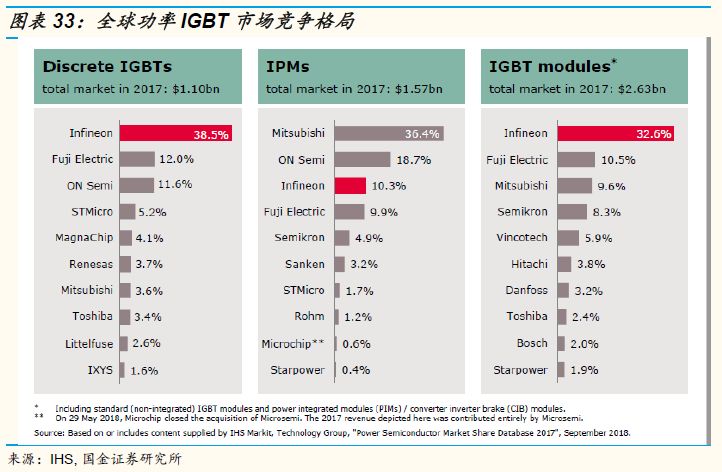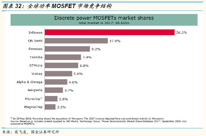 从公司产品结构也能看出分立器件在整个产品中的营收占比是呈现明显的上升趋势,从2015年仅占营收的20%提升至2018年的34%,而且是公司各个业务平台中提升最快的。而且结合未来汽车电动化和工业智能化的趋势来分析,这种占比提升的趋势将会持续下去,所以未来3-5年内分立器件平台尤其是MOSFET和IGBT将会成为公司非常重要的一个平台。