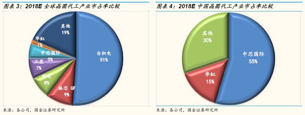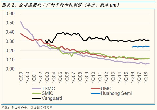 根据我们国金证券研究所的估算,目前华虹的加权平均制程为246纳米,远差于台积电的60纳米,联电的113纳米,及中芯国际的117纳米,而略优于世界先进的313纳米,但因为没有庞大的同类型竞争者(产品线也与世界先进的显示驱动,电源管理芯片大不同),靠着各种特殊产品组合的改善,华虹逐年增加其晶圆代工单价并改善其利润,又因多投资晶圆厂旧设备,华虹的折旧成本仅占全部营业成本不到26%的比重,远低于联电的40%及中芯国际的38%,这让华虹的毛利率近倍数于联电及中芯国际的毛利率。而配合中国晶圆代工半导体产业为提升自給率的企图心预期,从现在的20%拉升到2025年的25-30%,我们认为小而美的华虹,未来几年,可以有18-20%的营收成长率,持续拉升其市占(现在华虹仅有1%全球市占及15%的中国市占),这是近倍于我们对中国晶圆代工产业生产销售额的10-12%复合成长率(2018-2025年)预估,不同于华虹,我们认为中芯国际在先进制程的研发支出会持续投入,但为了避免在14及7纳米于2020,2022量产后亏损持续扩大,我们预估中芯国际在先进制程工艺产能及营收的扩张就会比较保守,而其复合成长率将会低于中国晶圆代工产业生产销售额10-12%复合成长率的预估。
