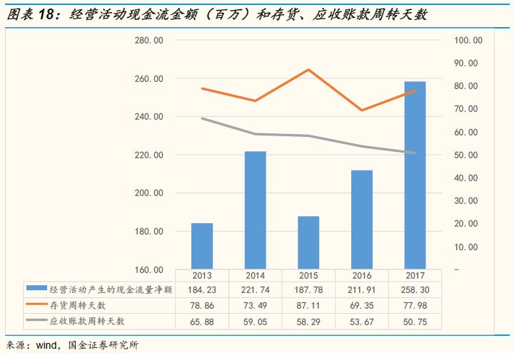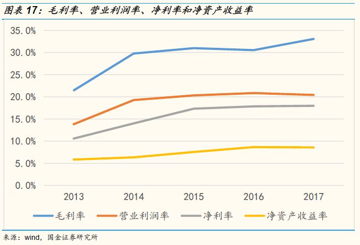 毛利率不断提升,长期盈利能力较强。公司的ROE水平近5年有了较大的提升,从2013年的5.9%提升至2017年的8.6%,进一步分析可以发现很大程度上源自于毛利率水平的大幅攀升,从2013年的21.5%提升至33.1%。营业利率润从2014年之后保持相对稳定,净利率则在2015年以后保持相在18%左右,综合来看公司的盈利水平相当出色,而且从长期来看较高的ROE水平意味着带给股东长期的回报率也更高。