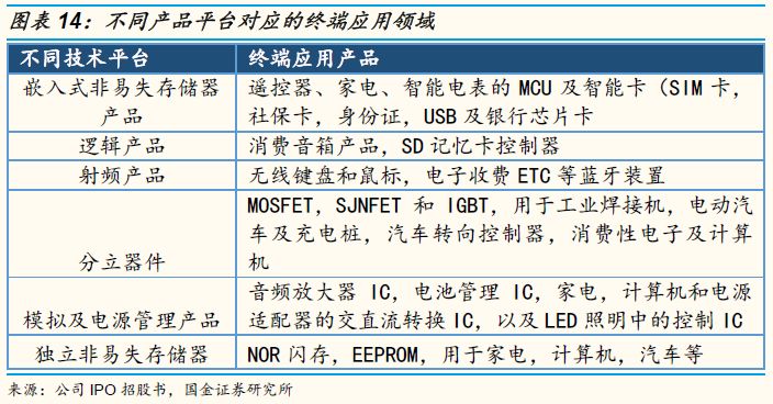从代工产品的终端应用市场来分析,其中智能卡芯片主要应用在SIM卡,社保卡,身份证,USB及银行芯片卡、中高阶微控制器(MCU)在智能家居和汽车电子钟应用更为广泛。分立器件平台生产的MOSFET,SJNFET和IGBT,多用于工业焊接机,汽车转向控制器,家电及电脑。电源管理芯片的应用也非常广泛,在音频放大器IC,电池管理IC,家电,电脑和电源适配器的交直流转换IC,以及LED照明中的控制IC都会使用电源管理芯片调节不用应用对于电量的消耗,达到节约电能的效用。