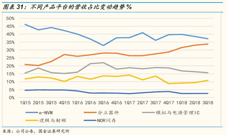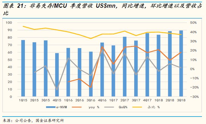 公司的非易失存储器平台是公司营收占比最高的产品平台,占比稳定在35%以上,而且到2016年4季度之后营收增速大幅攀升至20%以上的高增速水平而且一直保持至2018年。仔细分析MCU行业可以发现随着MCU价格的不断下降,当价格下降到足够低的水平的时候,MCU产品的应用范围开始不断拓宽,下游的需求量开始增长。在物联网浪潮的驱动下,下游的需求大幅增长带动MCU行业进行新周期。在未来MCU和智能卡为代表的智能化趋势非常明确,尤其是在无锡的12英寸新产线投产之后,公司可以将最新量产的第二代90纳米eNVM和MCU平台扩展至更先进的55纳米制程,有效提升产品的竞争力水平,所以我们认为未来3至5年内公司的eNVM和MCU依然会是公司的主力产品。