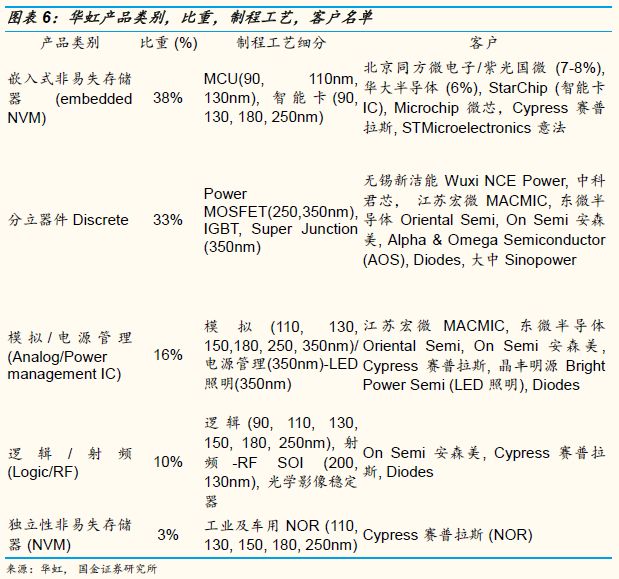 而在Power MOSFET, IGBT, Super Junction(33%的营收占比)各种电力相关的半导体部分, 应用领域横跨计算机,消费性电子,电动汽车及充电桩,轨道交通, 电源应用,工业用,国内的无锡新洁能 (Wuxi NCE Power), 中科君芯 (Jiangsu CAS-IGBT Technology), 江苏宏微 (MACMIC), 东微半导体 (Oriental Semiconductor), 大中 (Sinopower, 6435 TT), 及美国的Alpha & Omega Semiconductor (AOS US), On Semiconductor (安森美, ON US)是使用华虹250, 350纳米制程工艺的重量级国内,外分立半导体客户。