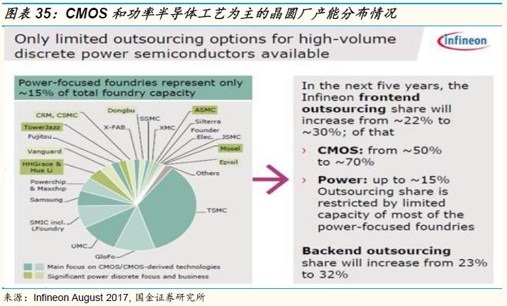 由于8英寸晶圆厂的产能有限,参考行业龙头英飞凌的制造的外包比例大约为15%,行业的市场空间大约有25亿美金,高塔,华虹和世界先进半导体合计占市场空间的1/3,仍有相当大的提升空间。以功率器件为主要产能的晶圆代工厂产能不足,面对汽车电动化(从18升级到250个Power MOSFET的用量转化)和物联网浪潮下对于功率器件的旺盛需求将继续代工公司的在公司器件领域的营收保持较高速度增长,我们预计未来3-5年华虹在分立器件平台的业务增速应该会保持在30%以上的增长水平。