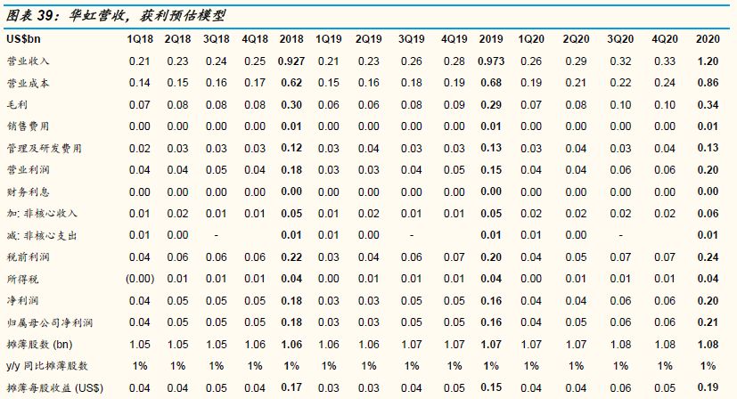 因为短期下行周期,我们对华虹的营收及获利预估是明显低于彭博社分析师的平均预期,未来几个月对华虹预期的下修,当然会对短期股价造成压力。以2019及2020年的预测为例,我们预估5%及23%的营收同比成长,低于彭博社分析师平均预期的10%及19%营收同比成长,我们预估30%及28%的毛利率,明显低于彭博社分析师平均预期的32%及31%,我们预估16%的营业利润率,低于彭博社分析师平均预期的19%及18%。我们预估US$0.15及US$0.19的摊薄每股收益,低于彭博社分析师2019年平均预期的US$0.17, 但高于彭博社分析师2020年平均预期的US$0.18,因为无锡市政府对12“厂的补助及加回少数股东损益,我们对2020及2021-2022年比市场有较乐观的预估。