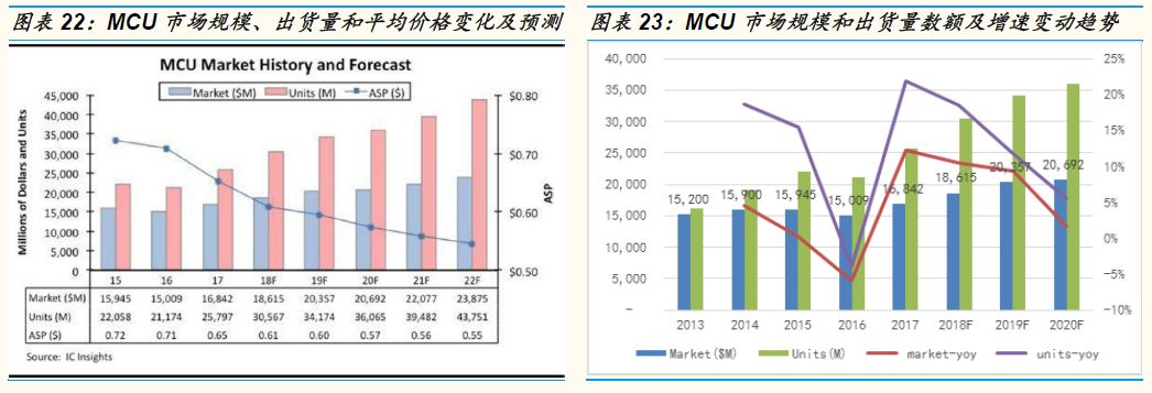 IC insights数据显示2017年全球MCU市场达到168亿美元,2018年MCU市场规模上升11%(仅占全球半导体产业销售额的4%,但同比增长是远高于2018年非存储全球半导体的5-7%同比增长),达到历史最高水平186亿美金,2019年同比增长9%行业规模突破200亿美金。该咨询机构同时上调未来5年行业销售额复合增速至7.2%,出货量复合增速至11.1%,预估2022年MCU全球市场规模有望接近240亿美金。2017年国内MCU市场迎来高增长阶段,据市场研究机构IHS数据,2017年中国MCU出货金额达到46亿美元,同比增长17.6%,其中增长最快的是消费电子市场,增速超过25%。其次是汽车电子市场,在汽车电动化趋势下以及新能源汽车的销售拉动下提升了MCU的出货量,工控市场的增速为14.1%,排在第三位。因为国内IC设计产业的蓬勃发展以及晶圆制造自給率的提升,我们预估未来5年中国MCU行业销售额复合增速将轻易的超过12%。