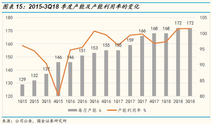 公司有三座8寸英寸晶圆厂和1座在建的12英寸晶圆厂,目前公司的产能以8英寸产线为主。1号晶圆厂于1999年投产,2号晶圆厂于2007年投产,3号晶圆厂在2003年量产出货,这三座晶圆厂全部都是200mm晶圆产线。目前公司的产能利用率持续位于高位,据公司2018年2季报和3季报显示,下游需求持续高景气,公司的产能利用率超过100%,出货量也达到历史峰值172K/月。