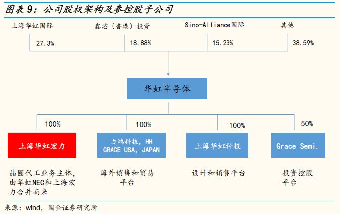 华虹半导体作为上市公司主体,旗下的上海华虹宏力是公司晶圆代工业务主体,由华虹NEC和上海宏力合并而来,另一家全资子公司上海华虹科技是公司设计和销售平台,另外公司还有三个子公司作为海外销售和贸易平台,分别是力鸿科技,HH GRACE USA和HH GRACE JAPAN。公司的股权相对比较集中,第一大股东上海华虹国际持有公司股份27.3%,其次鑫芯(香港)投资和Sina-Alliance国际分别持股18.88%和15.23%,前三大股东合计持有公司股份比例约为61.41%。