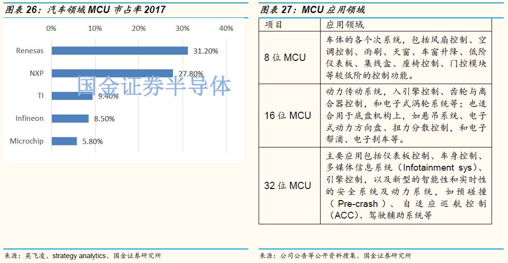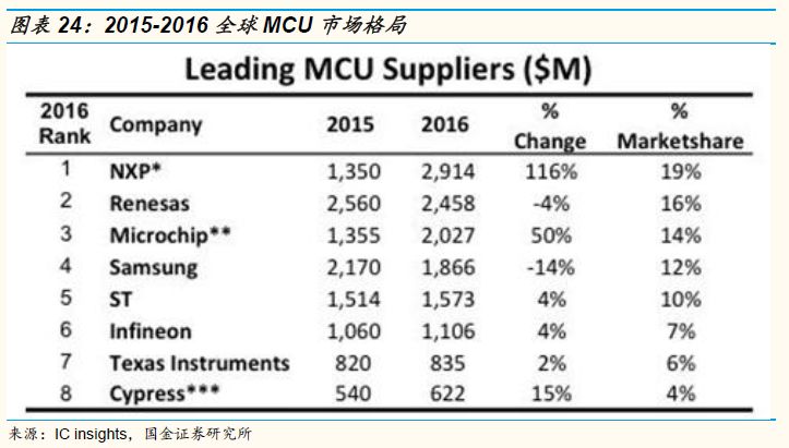 从MCU全球产业格局来看,2016年全球市场份额排名前五的厂商分别为恩智浦NXP(19%),瑞萨Renesas (16%),微芯 Microchip(14%,华虹前15大客户),三星 Samsung(12%)和意法半导体ST(10%,华虹前15大客户),前五大集中度超过70%,如此高的行业集中度也是由于近几年MCU行业出现了多起并购所致。低端MCU产品如4bit ,8bit和16bit MCU国内自给率较高,但是高端产品如32bit MCU市场基本还是被美日欧韩等半导体巨头垄断。近年来国内厂商开始以产品价格优势进入32bitMCU市场,如A股上市公司兆易创新(603986 CH)基于ARMCortexM技术的MCU芯片受到了市场的欢迎。在商业模式上国内的MCU厂商以Fabless为主,与传统IDM大厂一体化设计制造模式有所区别。