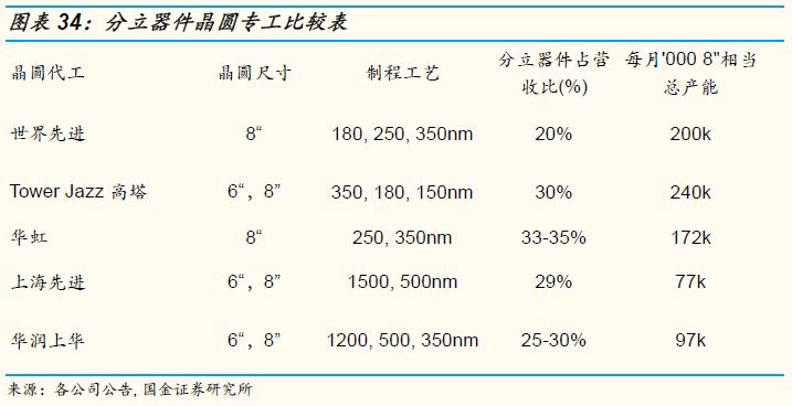 在分立器件的晶圆代工特殊领域的主要竞争者为世界先进(5347 TT),Tower Jazz (高塔半导体,TSEM IT), 上海先进(Advanced Semiconductor Manufacturing, 3355 HK)(于2018年10月30日宣布与积塔半导体合并),还有华润上华。以产能与制程工艺来看, 世界先进, 高塔,与华虹在分立器件晶圆代工中分庭抗礼,但世界先进与华虹客户重叠性非常低(已知前五大分立器件客户,只有一家重叠), 所以彼此也没有明显的价格竞争。 高塔半导体和分立器件龙头商英飞凌有紧密的合作关系,从营收范围来看,高塔半导体30%的营收来自功率半导体的代工,按照彭博预估公司2018年的营收约为13.11亿美金,30%占比的功率半导体营收约为3.93亿美金,而华虹半导体2018年营收约为9.27亿美金,按照33%的营收占比计算约为3.09亿美金,世界先进2018年营收约为942亿美金,按照20%的营收占比为功率器件来计算约为1.88亿美金。