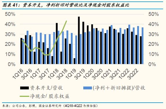 稳定的自由现金净流:为追求先进制程工艺竞赛与突破,往往造成每股收益的越加摊薄或净负债对股东权益比重的恶化。我们认为华虹稳定的自由现金净流归因于其晶圆代工事业的市场定位,造成远高于同业的20%净利润率及33%的净利加折旧占营收比率,买旧制程设备让资本开支对营收比(<25%)相对合理并低于经营活动现金净流。