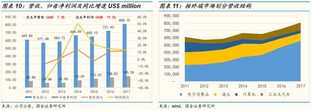 过去五年公司营收复合增速为7.2%,归母净利润复合增速为19.5%,2018年公司营收9.27亿美金,归母净利润为1.84亿美金。按照终端应用市场不同,公司代工的半导体产品应用于电子消费品,通讯市场,计算机,汽车及工业控制等领域。电子消费品市场贡献了绝大部分营收,占比达到65%,其他市场营收占比依次为通讯(19%),汽车及工业控制(10.0%)和计算机(5%)。物联网和汽车电动化趋势下带动电子消费品和汽车及工业控制这两个行业增速较高,2017年同比增长18%和26%,但是通讯计算机市场营收分别下滑10.3%和15.1%,主要原因在于手机销量放缓以及PC出货量持续下滑。