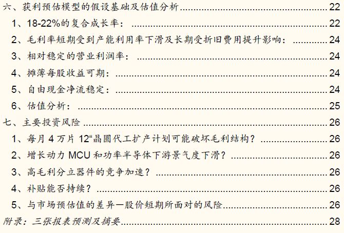 12“晶圆代工扩产计划所拉高的折旧费用可能破坏毛利结构,增长动力的MCU和电力功率半导体下游景气度的下滑,高毛利分立器件晶圆代工的竞争加速,而与市场预估值的差异是短期所面临的风险。
