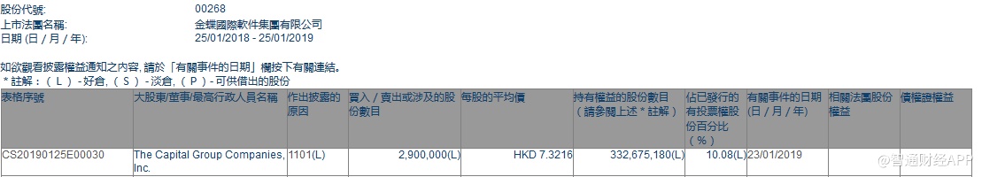 智通财经APP获悉,根据联交所资料显示,The Capital Group于1月23日增持金蝶国际(00268)290万股,每股作价7.32港元,总值2122.8万港元,最新持股数增至3.32亿股,最新持股比例增至10.08%。