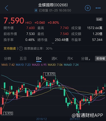 截至今日收盘,金蝶国际(00268)涨0.80%,报7.59港元。