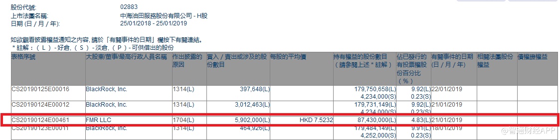 智通财经APP获悉,根据联交所资料显示,FMR LLC于1月21日减持中海油田服务(02883)590万股,每股作价7.52港元,总值4436.8万港元,最新持股数减至8,743万股,最新持股比例减至4.83%。