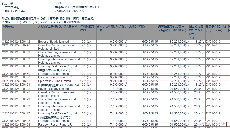 智通财经APP获悉,根据联交所资料显示,Paragon Resort Fund L.P.于1月22日及23日减持福莱特玻璃(06865)1671万股,每股分别作价2.5135和2.5195港元,总值4207.64万港元,最新持股数减至8225万股,最新持股比例减至18.27%。