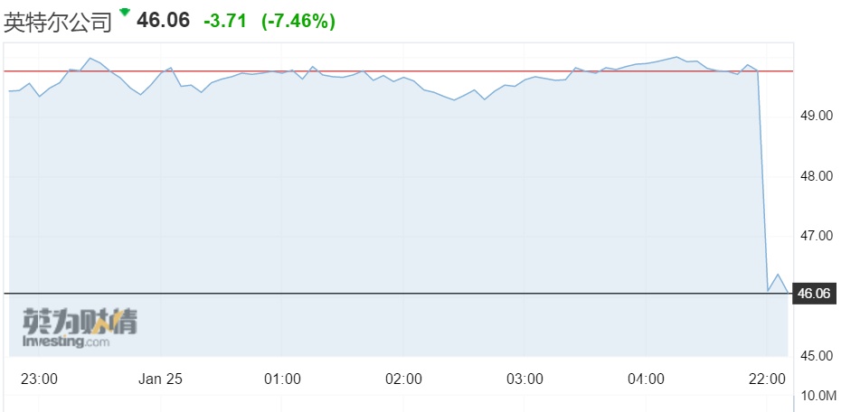 智通财经APP获悉,英特尔(INTC.US)开盘跌幅一度扩大至7.8%,迅速抹平年内涨幅。截至发稿跌7.46%,报46.06美元。