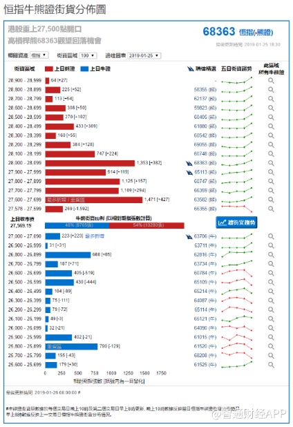 智通财经APP获悉,截至1月26日,恒指最新的牛熊街货比例46:54。从瑞信恒指牛熊证街货分布图中得到的数据显示,熊证街货重货区在27600-27699区间,该区间最新熊证数量为1471张,较上一交易日增加427张,同时该区间也是最多新增区间。牛证街货重货区在25800-25899区间,该区间最新牛证数量为790张,比上一交易日减少129张,最多新增区间在27000-27090区间,新增223张。