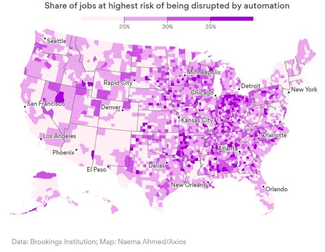 媒体Axios根据布鲁金斯学会上述报告制作了以下图表,用深浅不同的紫色展示自动化在不同地区对就业威胁的大小。我们可以发现,35%及以上就业受到威胁的地区主要出现在美国腹地。若这种就业被取代的风险成为现实,随着美国腹地的中低收入工作进一步减少、甚至消亡,城乡差距引起的国内愤怒民情和极端化表现只会愈演愈烈。