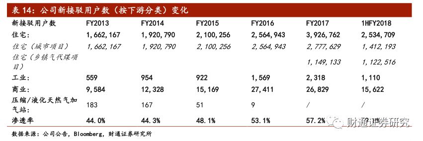 燃气接驳:乡镇项目新接驳强劲增长,整体接驳率仍有较大进步空间。公司铺设城市燃气管网后,为下游工商业用户及居民用户安装燃气终端,并一次性收取接驳费。截至1HFY2018,公司新接驳居民用户数253万户(+18.3%),其中城市项目141万户(-1.7%),乡镇煤改气项目112万户(+59.1%)。从渗透率看,城市燃气项目的接驳率已高达59.8%,但对比发达国家成熟市场平均80%的接驳率,仍有较大进步空间,未来该业务盈利有望继续增长。此外,公司新接驳工业和商业用户分别为1110和15622户,同比分别增长0.1%和16.1%。
