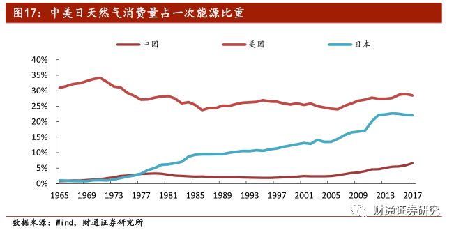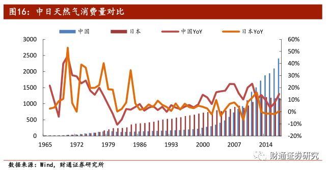 从中日天然气消费对比来看,中国天然气消费增速约处于日本上世纪七十年代,即对应日本刚进入快速发展期。