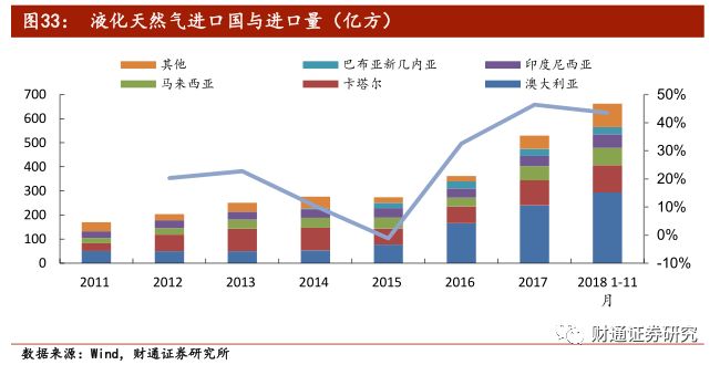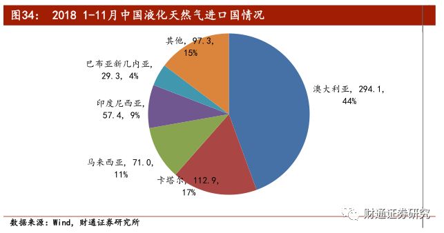我国主要从澳大利亚、卡塔尔和马来西亚等国家进口液化天然气,2018年1-11月我国从澳大利亚进口液化天然气约294.1亿方,占比液化天然气总进口量44%。