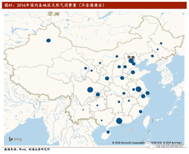 从各地区天然气消费量来看,2016年天然气消费量主要集中在长三角、珠三角和京津冀地区,随着北方煤改气的持续进行,未来北方地区天然气消费量有望贡献较大增量。