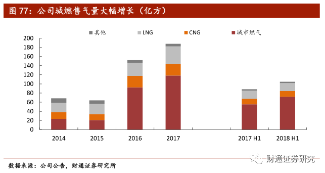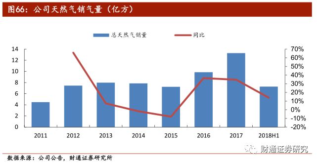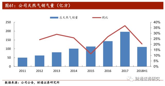 公司燃气销售量维持高速增长的态势,2017年总销气量达196.16亿立方米,同比增长36.9%,2018年上半年销气量110.62亿立方米,同比增长20.4%。