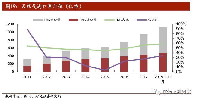 预计未来天然气供需仍将维持紧平衡,需求端主要受煤改气等政策持续推进,供给端主要由进口LNG满足。1)需求端:2018年1-11月我国天然气表观消费量达到2536.26亿方,同比增长17.91%,对外依存度创43.30%的新高。结合“能源发展十三五规划”和近两年国家对煤改气的政策执行力度看,未来两年国内天然气需求仍有望保持10%以上的较快增速;2)供给端:由于国产气产量和进口管道气供应量增长相对较为稳定,未来国内天然气需求的增量主要还是由海外进口LNG来满足。2018年1-11月进口管道天然气468亿方,同比增加22%;进口液化天然气660.53亿方,同比增加44%,未来LNG的占比有望进一步提升。