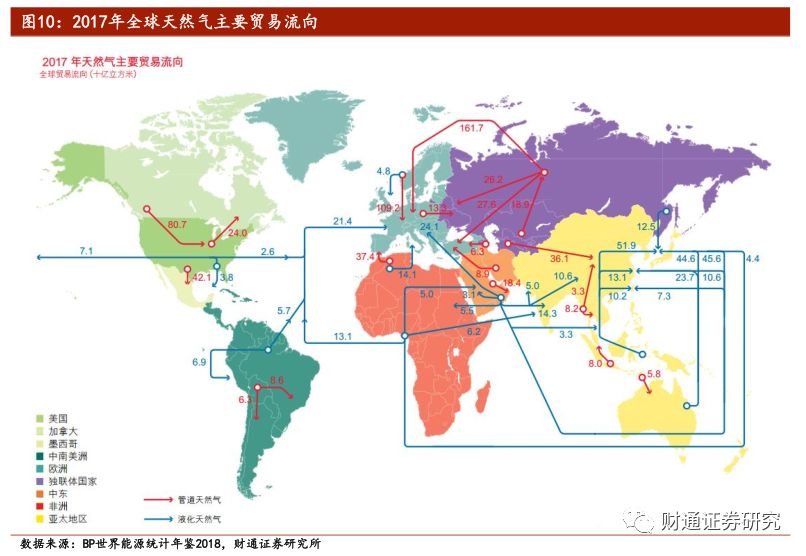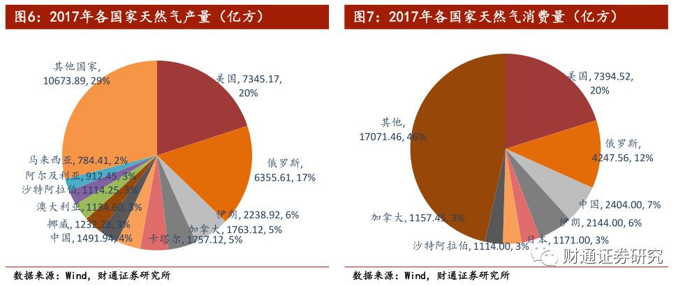 受天然气在地区间分布不均影响,部分国家的天然气产量与天然气消费量具有较大的差异,如俄罗斯2017年天然气产量全球占比17%,消费量占比则只有12%,剩下的部分全部用于出口;中国情况则相反,产量和消费量占比分别为4%和7%,不足部分需要从其他国家进口。产量与消费量的不均极大提升了全球天然气贸易。