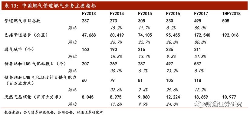 城市燃气经营具有区域垄断性,公司通过招投标取得城市管道燃气特许经营权的方式来经营全国各个城市管道燃气的销售,根据公司债券评级报告,特许经营权期限一般在30年左右。截至2018年9月底,公司在26个省(包括自治区和直辖市)拥有管道燃气专营权的管道燃气项目已增加至508个(包含147个县、区级的乡镇气代煤项目),其中2013-2017财年管道燃气项目数年均复合增速超过20%。此外,近年来公司已建管道公里数、通气城市数目、储备站和LNG气化站数目及供气能力都呈现出较为快速的增长,为天然气销量增长提供有力支撑。