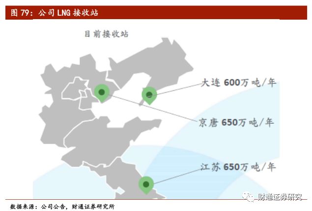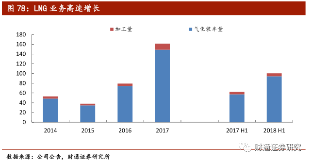公司目前有三个LNG接收站,处理能力总计1900万吨/年,2018年上半年负荷率已达70%,由于接收站处理能力在近两年供不应求,且新接收站建设周期较长,因此负荷率仍将继续提升,公司已经在现有的接收站基础上扩容,京唐接收站和江苏接收站的扩建预计将在2020-2021年投产,公司LNG业务增长空间进一步得到提升。
