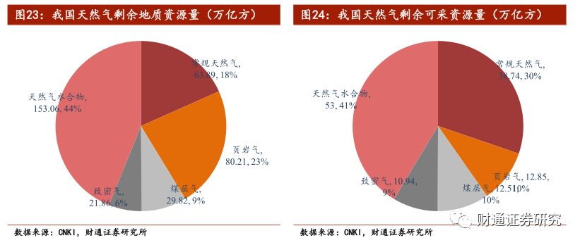 我国天然气资源剩余地质资源量合计约348.84万亿立方米,其中天然气水合物占比约44%,常规气占比约18%,页岩气、煤层气与致密气占比合计38%;天然气剩余可采资源量合计约128.04万亿立方米,其中常规气38.74万亿方,占比30%。