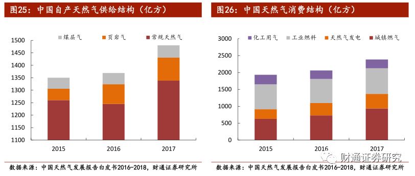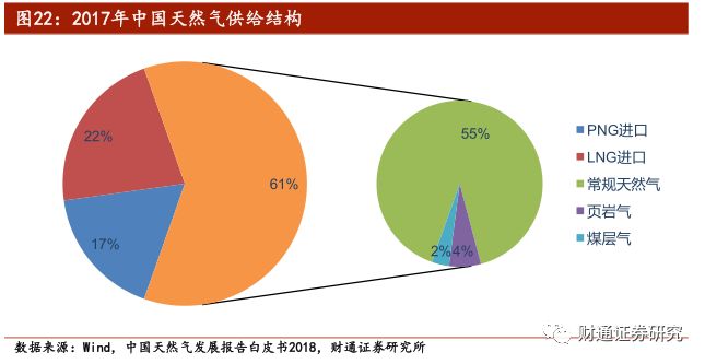 2017年我国天然气供给中,17%为进口管道天然气,22%为进口液化天然气,61%为国内自产天然气,其中常规天然气、页岩气和煤层气占比分别为55%、4%和2%:
