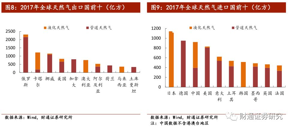 2017年全球天然气量出口前十的国家主要为一些天然气含量丰富的国家,如俄罗斯、美国、卡塔尔等,进口量前十的国家主要为天然气资源极其匮乏的国家(如日本)或产量完全不能满足消费量的国家(如中国)。从贸易量来看,主要的贸易方式为管道天然气,占比接近2/3。