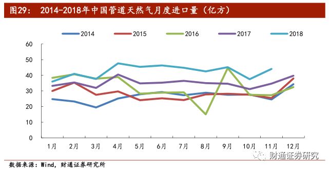 从近五年管道天然气月度进口数据来看,所有月份进口量均有所提升,2018年月度进口量提升尤为明显。