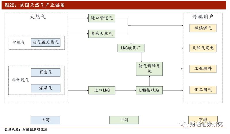 我国天然气产业链包括上游供给端、中游中转环节和下游的需求端,供给端为自产天然气、进口管道气和进口液化天然气,其中自产天然气包含常规的油藏天然气和非常规的页岩气与煤层气。下游需求端主要为城镇燃气、天然气发电、工业燃料和化工用气四块。