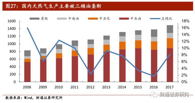 4.1 国内天然气:主要被三桶油垄断,产量稳定增长