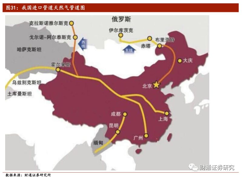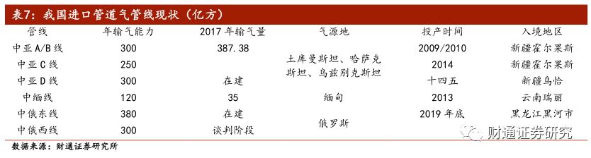 我国当前进口天然气的管道主要有中亚A/B/C线和中缅线,目前中亚D线和中俄东线在建,中俄东线预计年底投产,其设计年输气能力为380亿方/年。由于管道气管道建成到满产供气仍需要几年过度,中俄东线建成后第一阶段供气量则为80亿方/年,短期内我国管道天然气输送能力增量仍然有限。
