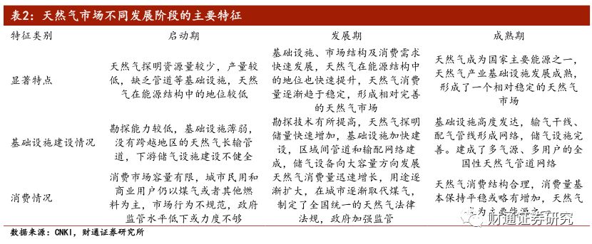 从海外成熟市场天然气发展历程看,各国天然气市场主要可以分为启动期、发展期和成熟期三个阶段,三个阶段的主要特征如下表所示: