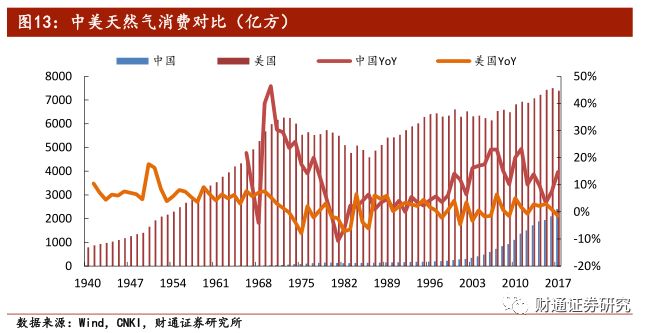 从中美天然气消费对比来看,中国天然气消费量及消费增速约处于美国上世纪五十年代,即对应美国刚进入快速发展期。