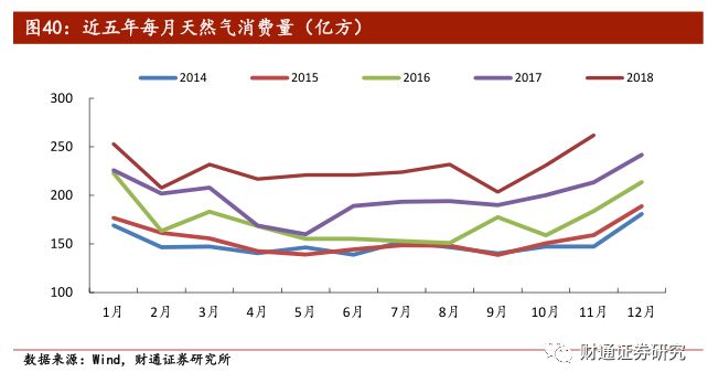 从近五年天然气月度消费量来看,天然气消费高峰主要为一季度和四季度,主要受采暖季的影响。